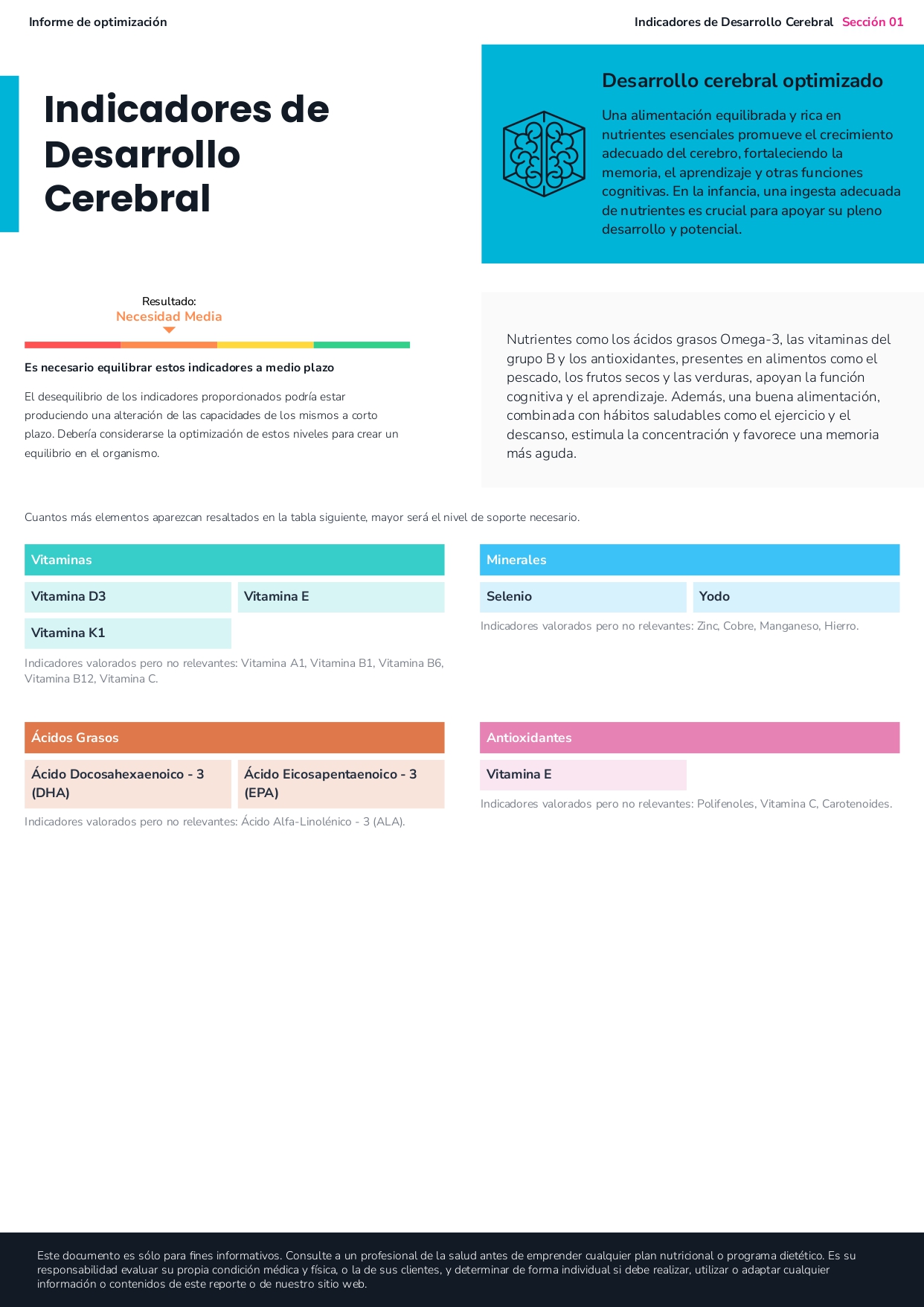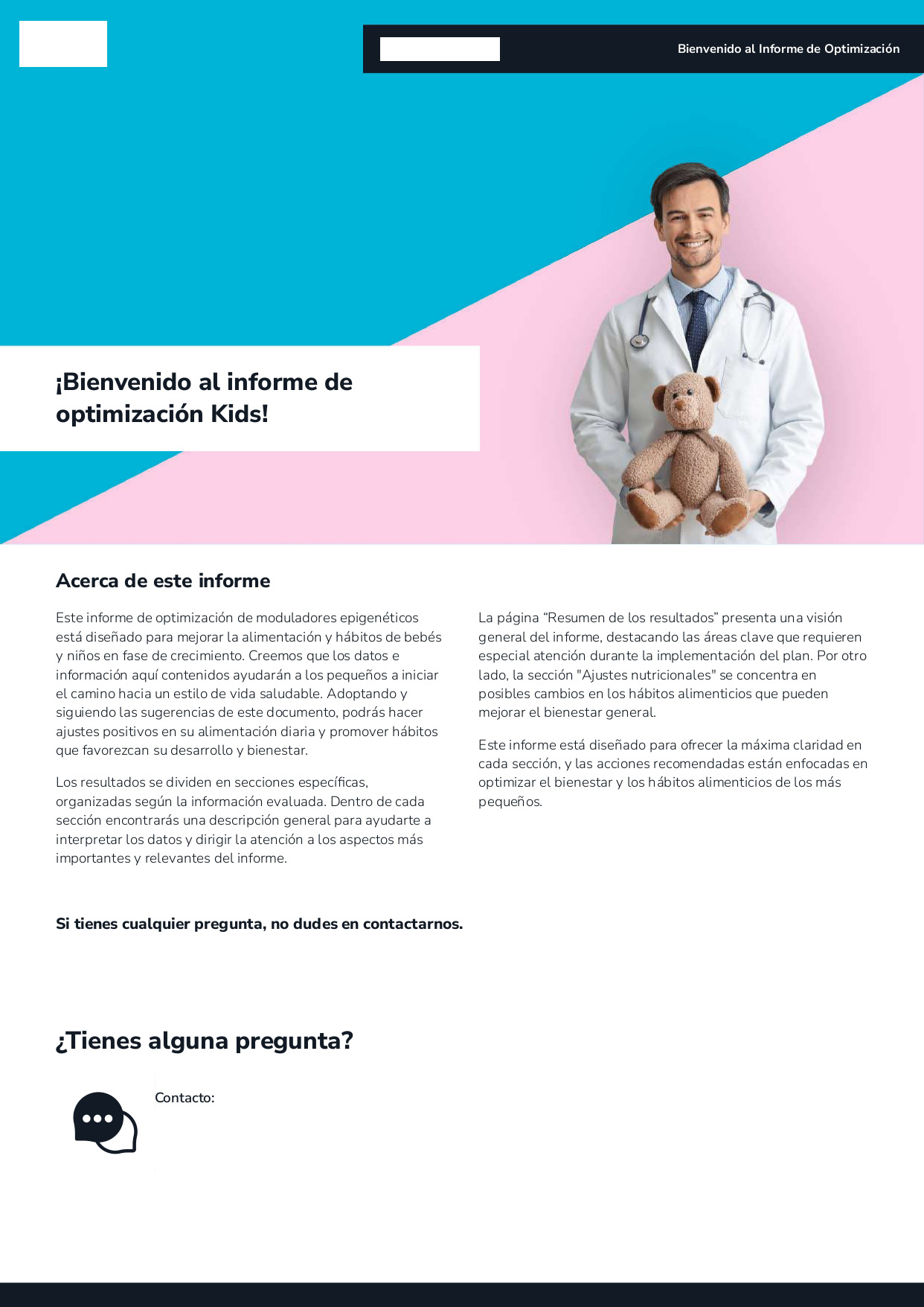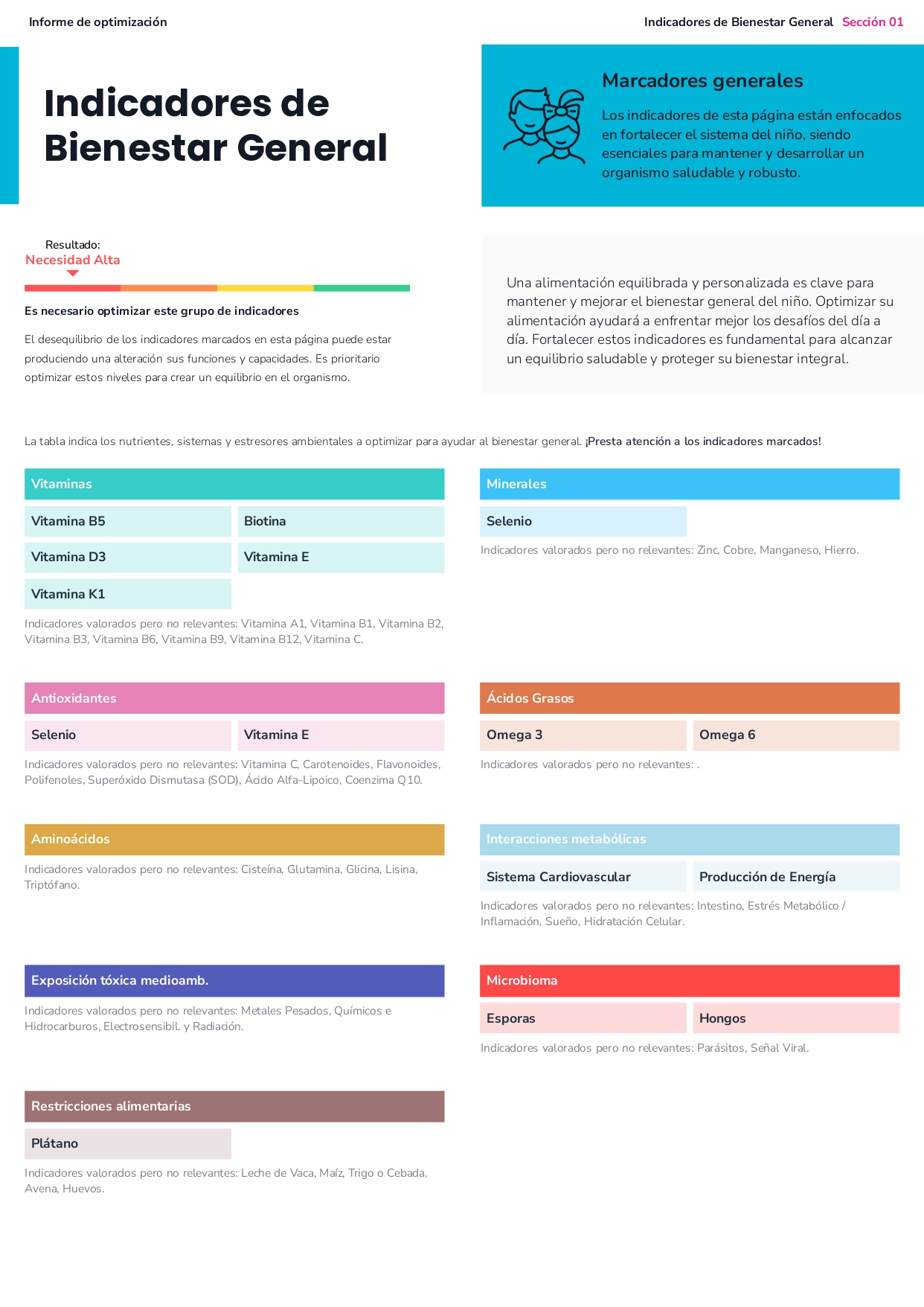 El informe de optimización Kids, ha sido diseñado por especialistas del sector que colaboran con nuestro equipo médico para todos aquellos profesionales de la salud que desean optimizar el bienestar de sus clientes más pequeños a partir del primer año de vida y hasta los 7.
